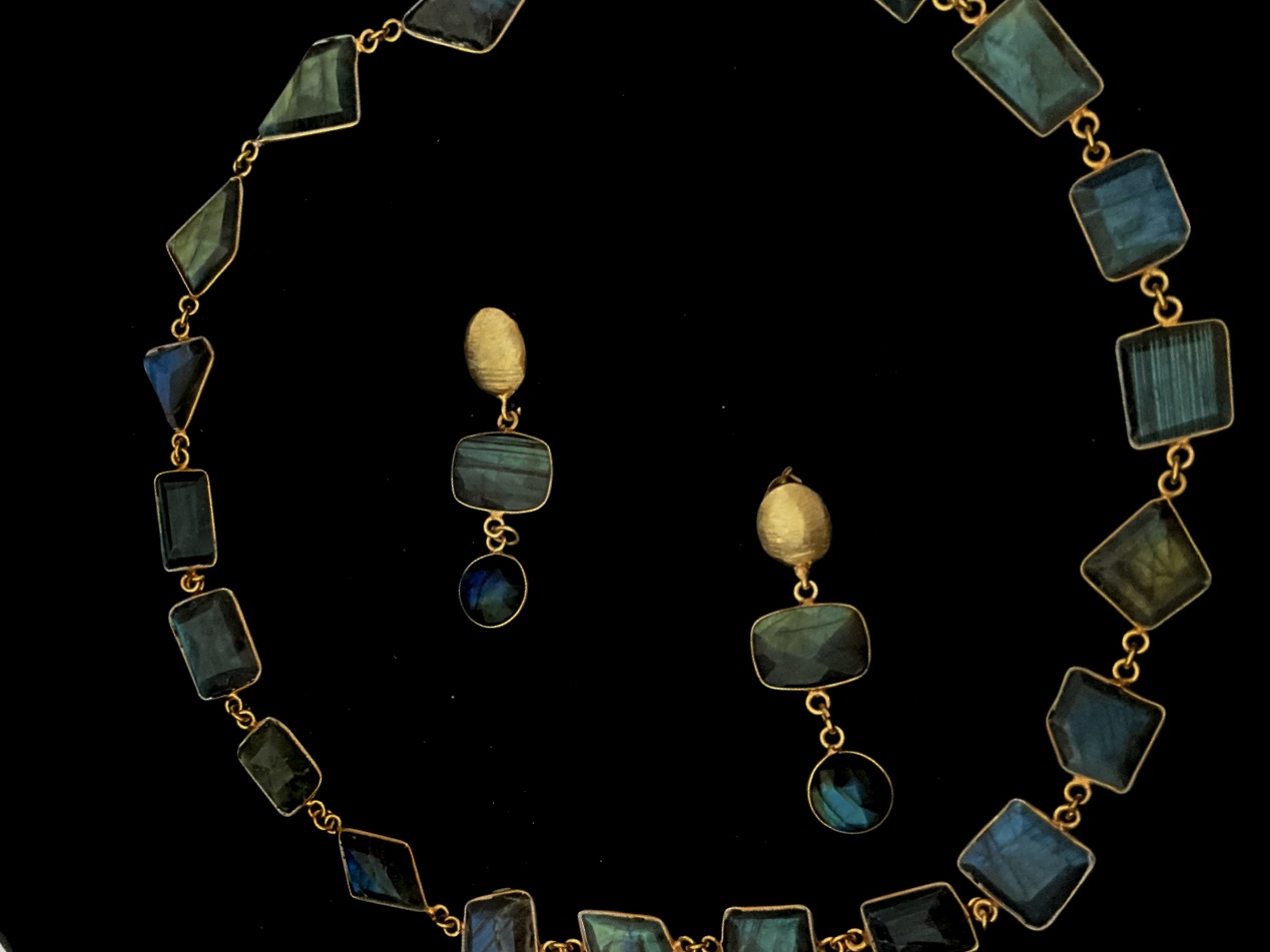 Succombez au magnétisme de la Labradorite avec cet ensemble exclusif comprenant un collier talisman et sa paire de boucles d'oreilles assorties.