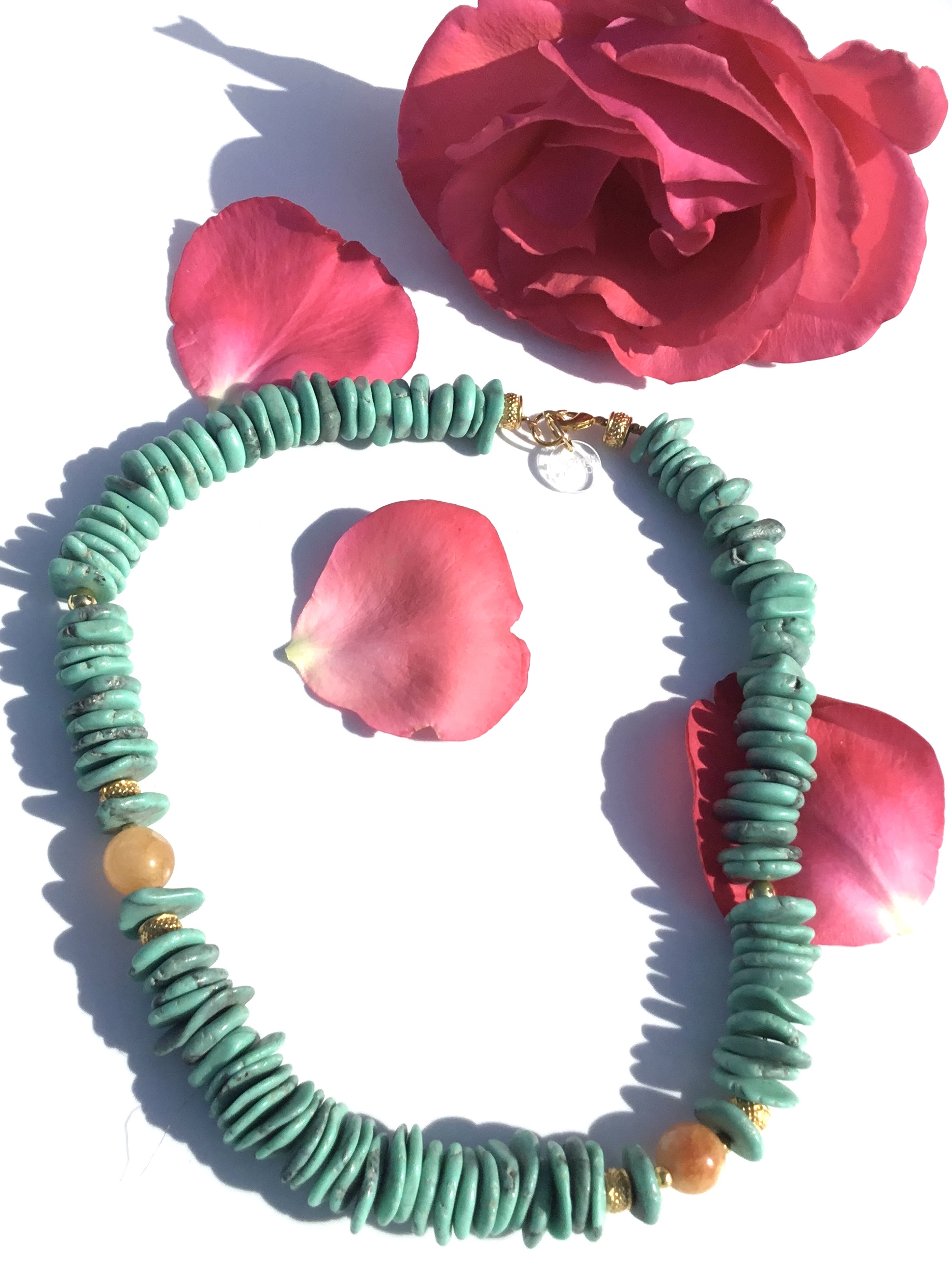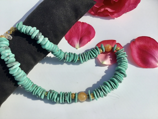Ce bijou marie la force du Jade beige naturel à l'éclat de la Howlite (teintée turquoise).