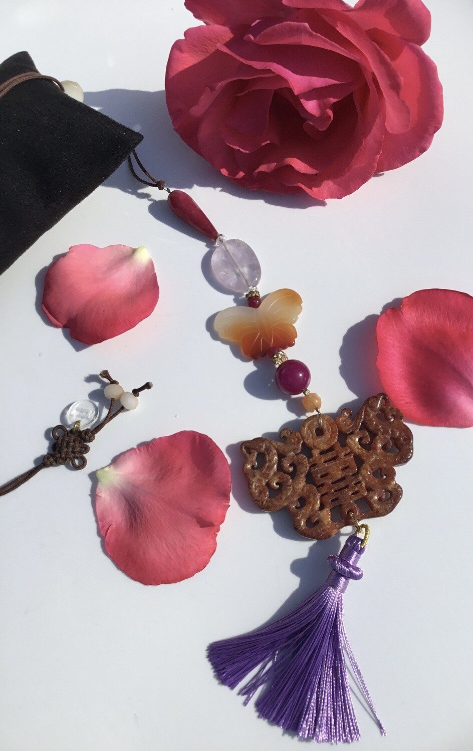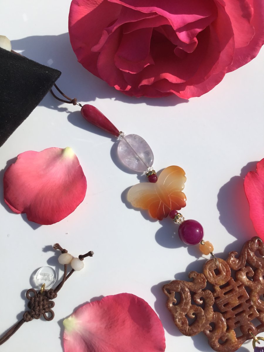 Pierres : Jade véritable (amulette & papillon) et perle d’Améthyste.