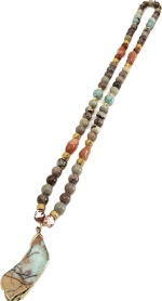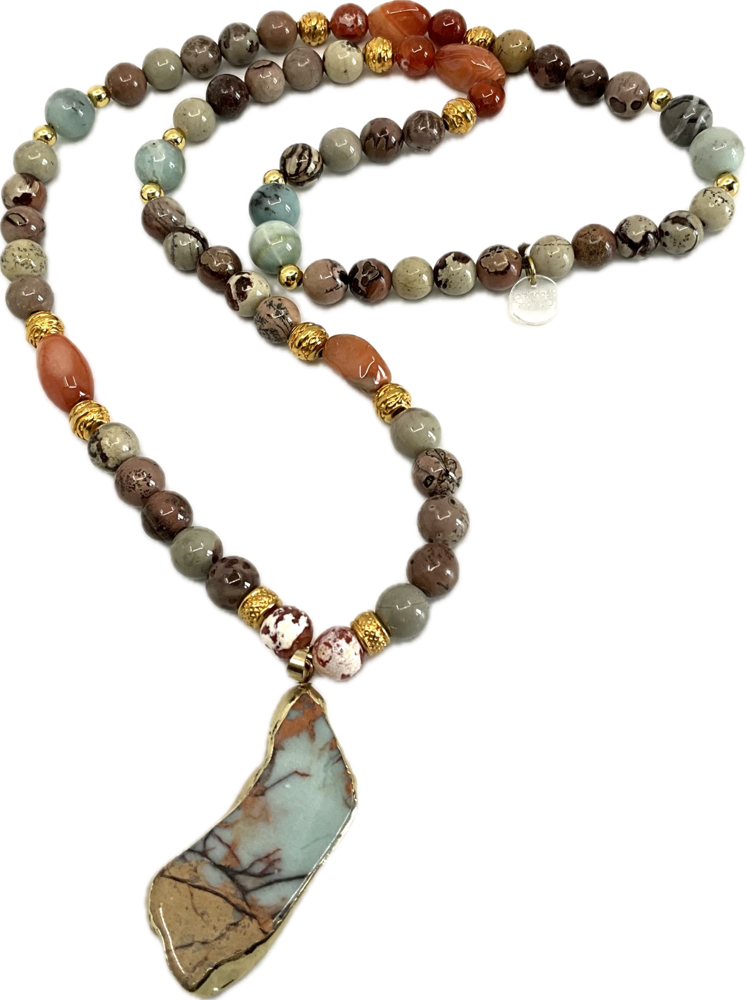 Ce sautoir est une rencontre brute entre la chaleur tellurique du Jaspe café et la clarté vibrante de l'Amazonite.